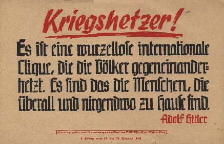 Warmongers! A rootless international clique sets the nations against each other. They are the people who are at home everywhere and nowhere. Adolf Hitler