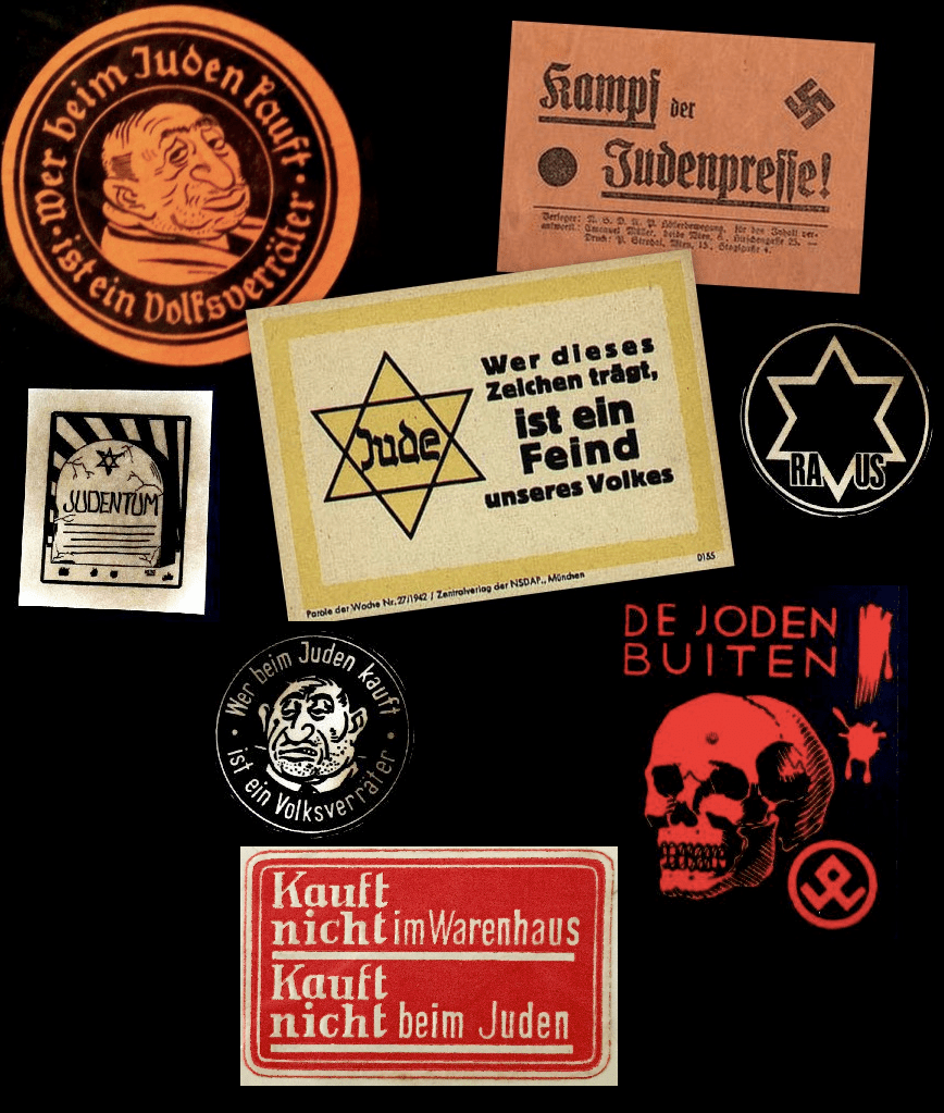 Whoever buys from Jews is a Traitor to his People + Fight the Jewish Press! + Whoever wears this Symbol is an Enemy of our People + DO NOT BUY from department stores, DO NOT BUY from Jews + JEWS OUT! (bottom right, in Flemish)
